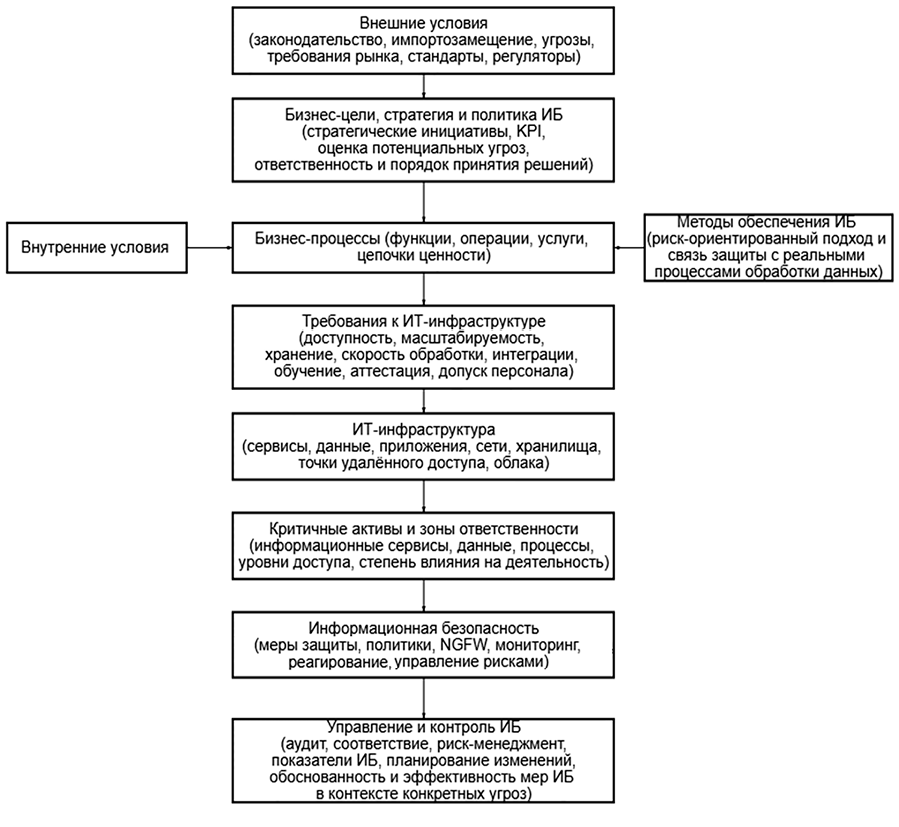 В условиях активной цифровизации экономики и перехода предприятий на современные сетевые технологии проблема защиты корпоративных сетей от внешних угроз и кибератак приобретает особую значимость. Особенно актуальна эта проблема в российском контексте, где политика импортозамещения в сфере информационной безопасности стала стратегическим приоритетом государства [10]. Внешнеэкономические ограничения 2022–2024 гг. привели к прекращению обновления и поддержки ряда зарубежных средств киберзащиты, включая NGFW [8]. В этих условиях первостепенной задачей стало внедрение отечественных межсетевых экранов нового поколения, обеспечивающих сопоставимый уровень защищённости и соответствие национальным стандартам. Одновременно такой переход требует всесторонней технической и экономической оценки, так как сопряжён со значительными затратами и влияет на стратегию информационной безопасности организации [1,6]. Следовательно, использование методических подходов, с учетом современных условий, позволяет системно оценивать угрозы и формировать требования к защите корпоративной сети. Цель исследования заключается в обосновании комплексного подхода к построению системы управления информационной безопасностью, с учетом современных требований к защите информации на предприятии, учитывающие законодательные, организационные, кадровые, цифровые решения для обеспечения соответствия требованиям бизнеса.
