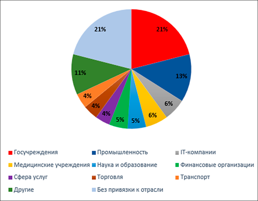 Современные внешние киберугрозы характеризуются высокой динамичностью и эволюционным развитием, связанным как с усложнением корпоративных ИТ-ландшафтов, так и с ростом доступности инструментов атаки [3]. Следовательно, одним из наиболее значимых факторов, влияющих на структуру угроз, является переход организаций к распределённым моделям работы и активное использование удалённого доступа [5]. Это приводит к расширению потенциальных точек входа, что облегчает злоумышленникам проведение разведки и подбор уязвимых элементов инфраструктуры. Структура распределения успешных атак по отраслям экономики также подтверждает приоритетность защиты корпоративных сетей. Наибольшая доля инцидентов приходится на государственный сектор, промышленность и ИТ-компании, что отражает фокус злоумышленников на объектах с высокой концентрацией критически значимых данных и сервисов. Данные, представленные на рисунке 2, демонстрируют отраслевую дифференциацию жертв кибератак и позволяют определить приоритетные направления применения средств NGFW.